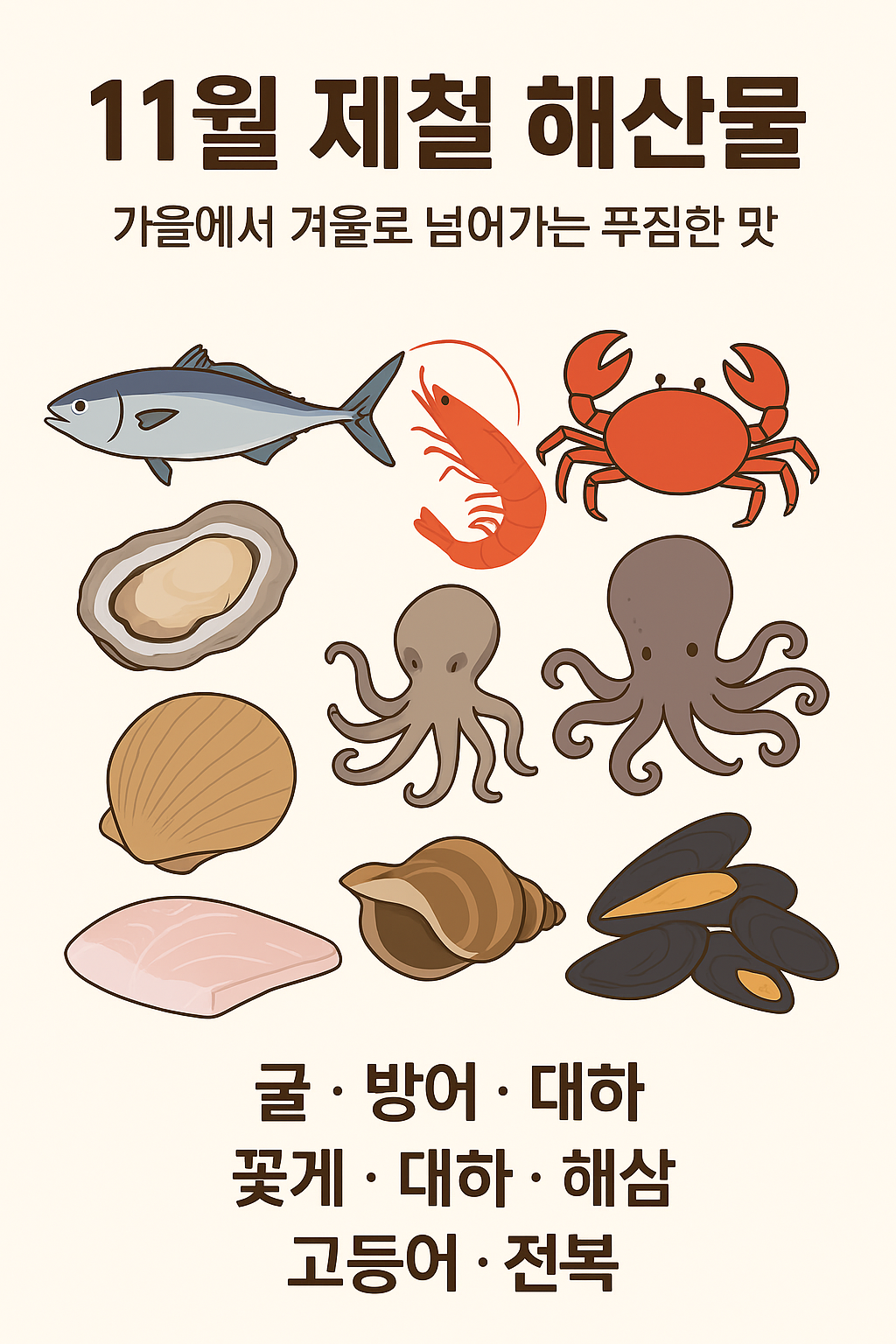 11월에는 굴, 대하, 방어, 꽃게, 전어, 홍합, 고등어, 임연수어, 전복, 우럭, 쭈꾸미 등이 제철입니다.